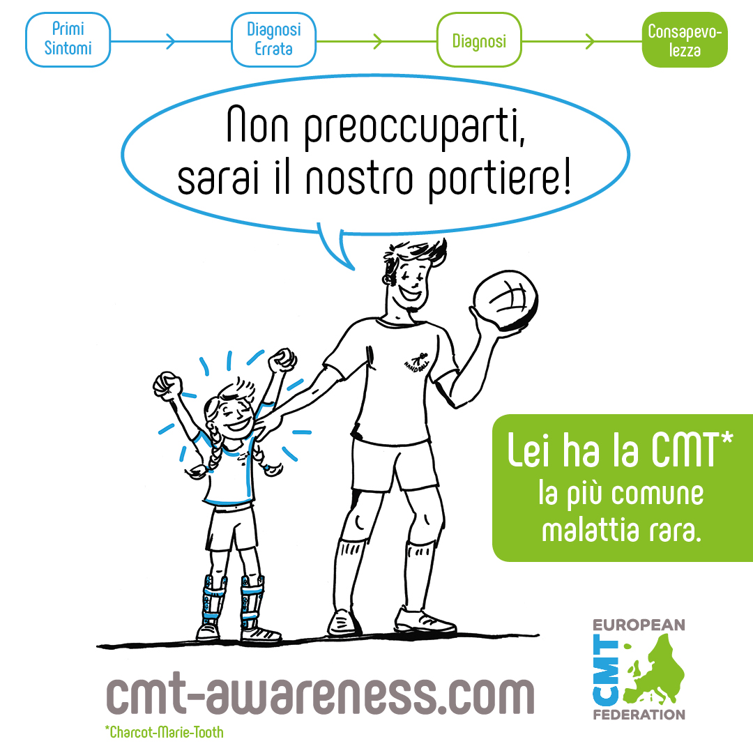La campagna per la Consapevolezza della Charcot-Marie-Tooth è una campagna europea a diversi livelli (media, poster in Stazione Centrale a Milano, pubblicità online, LinkedIn, etc.), condividete le grafiche della campagna con i vostri contatti e i link ai due siti per medici e pazienti.